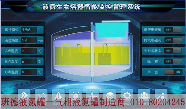 (4)每個樣本儲存罐配置的智能液氮容器監控管理系統都具有數據記憶、Modbus RS485通訊協議、溫度、液位、閥門開關狀態、超限報警、開蓋報警、故障報警等功能,儀器面板采用觸摸屏,以圖表形式顯示各項參數。同時獨立傳輸信號到控制中心,通過微機監控其使用狀況。