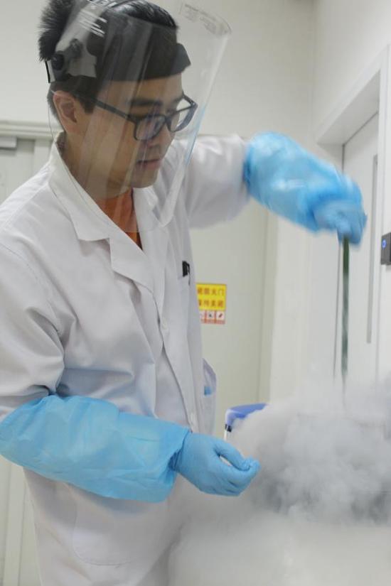 研究人員從液氮罐中取出干細胞。