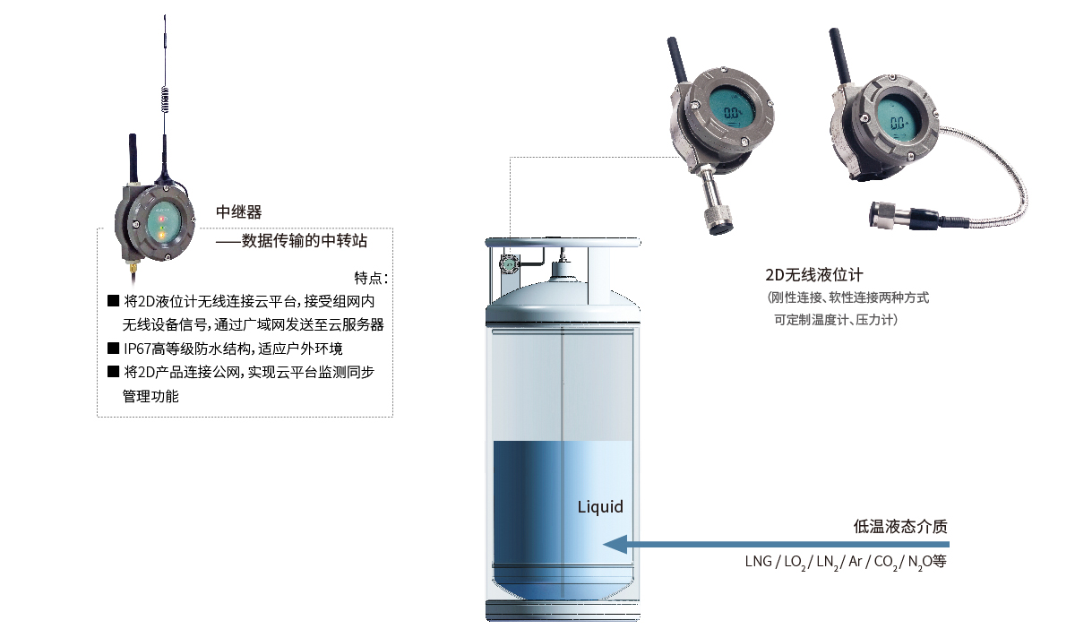 整套系統只通過一套數據中繼器及每個液氮罐杜瓦瓶上的無線液位計即可實現多終端的無線上網,數據互聯.